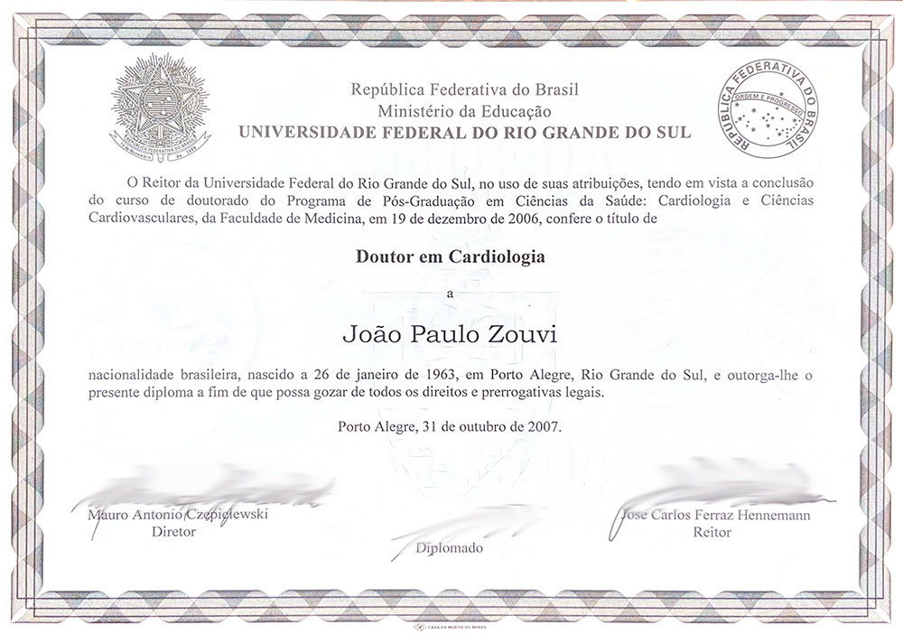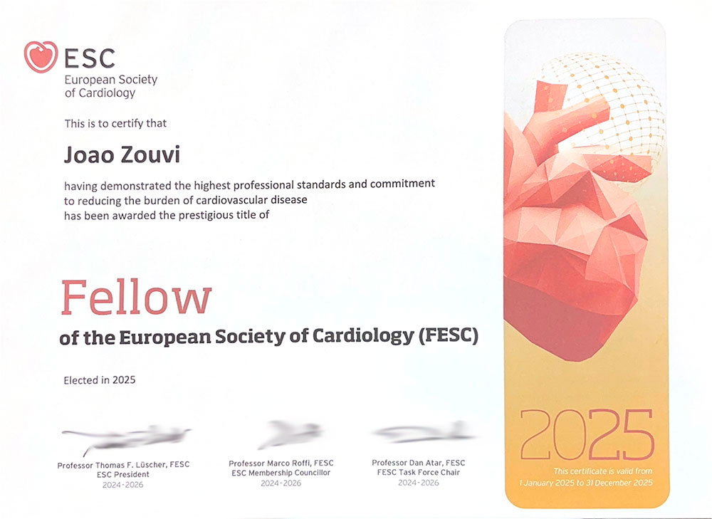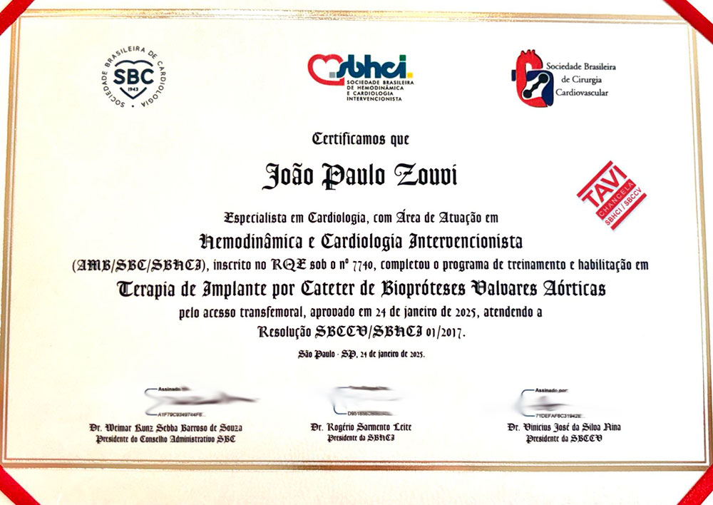 Fellow da Sociedade Europeia de Cardiologia - FESC Habilitação em TAVI Especialista em Hemodinâmica e Cardiologia Intervencionista Especialista em Hemodinâmica e Cardiologia Intervencionista Doutorado em Cardiologia Mestrado em Cardiologia Conselheiro Deliberativo Congresso London Valves